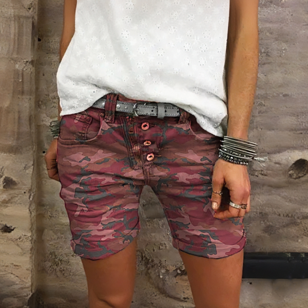 Margovil Elastic Waist Buttons Skinny Camo Shorts