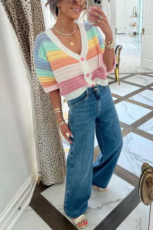 The Karleedress V Neck Button Up Striped Ribbed Knit Sweater is the perfect combination of style and comfort. Made with a V neckline and a button-up design, this sweater features a bold striped pattern and ribbed knit fabric for a flattering, trendy look. Stay cozy and chic with this must-have piece!